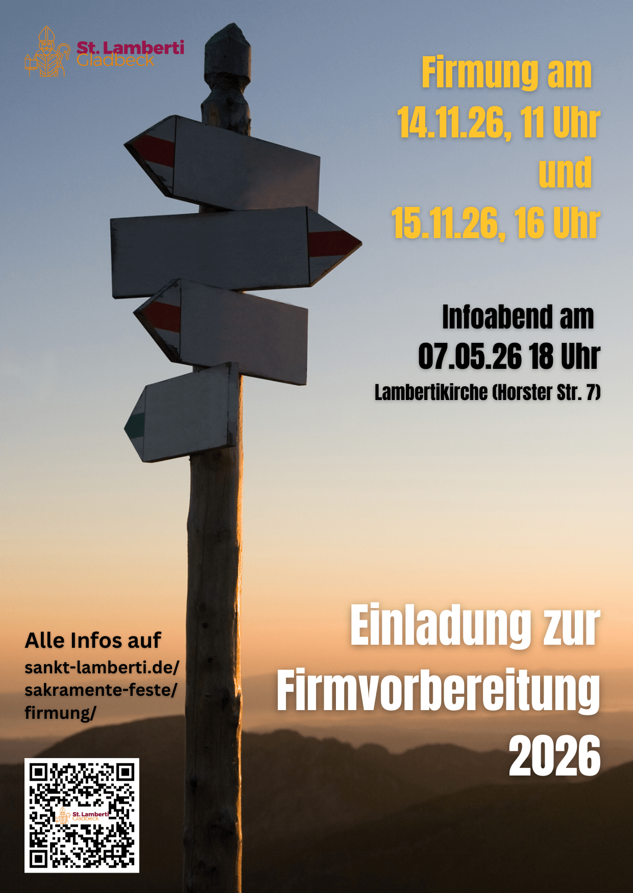 Die Firmvorbereitung der Propsteipfarrei St. Lamberti Gladbeck startet am 7. Mai 2026 um 18:30 mit einem Infoabend in der St.-Lamberti-Kirche (Horster Str. 7, 45964 Gladbeck). Eingeladen sind besonders Jugendliche, die zwischen dem 1.8.2010 und 30.9.2011 geboren wurden.