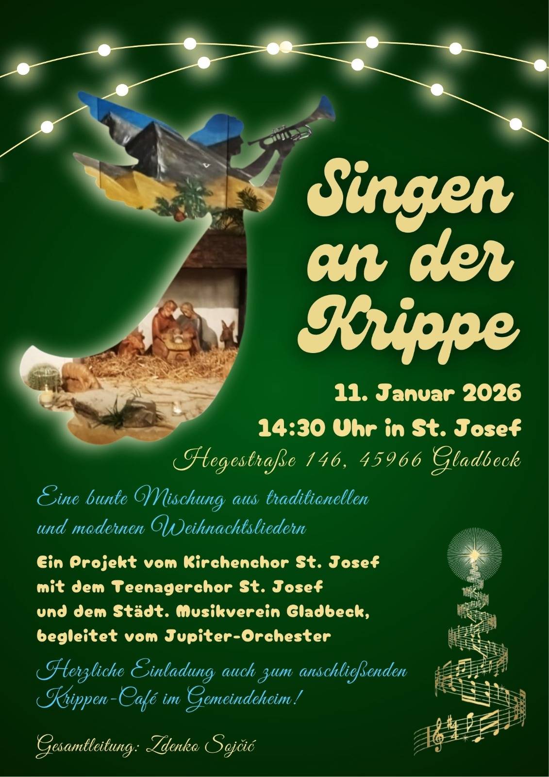 Singen an der Krippe Kirchenchor St. Josef Teenagerchor St. Josef Städtischer Musikverein Gladbeck e. V. Jupiter-Orchester Leitung: Zdenko Sojčić Eintritt frei |